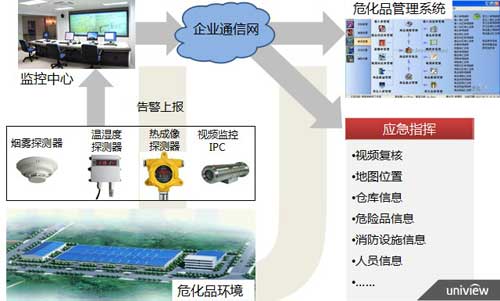 宇視可視化智慧安監(jiān)方案基于開放的IMOS平臺(tái),通過接入相關(guān)的智能環(huán)境探測器,報(bào)警聯(lián)動(dòng)視頻,并將環(huán)境信息、視頻監(jiān)控融合到企業(yè)安全生產(chǎn)應(yīng)用系統(tǒng)和危險(xiǎn)品監(jiān)管中,可以應(yīng)用在?;返纳a(chǎn)、運(yùn)輸、倉儲(chǔ)、銷售等各個(gè)環(huán)節(jié)。