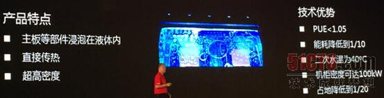 同時(shí)在曙光技術(shù)大會(huì)上展示了另一款高能效的技術(shù),全液冷產(chǎn)品。該產(chǎn)品現(xiàn)在還處于研發(fā)階段,主板等部件全部浸泡在無腐蝕不燃導(dǎo)熱性佳的液體里,展區(qū)工作人員表示該液體主要成分是油,可大幅降低能耗,相比傳統(tǒng)數(shù)據(jù)中心能耗降低90%以上,PUE可達(dá)1.05以下。
